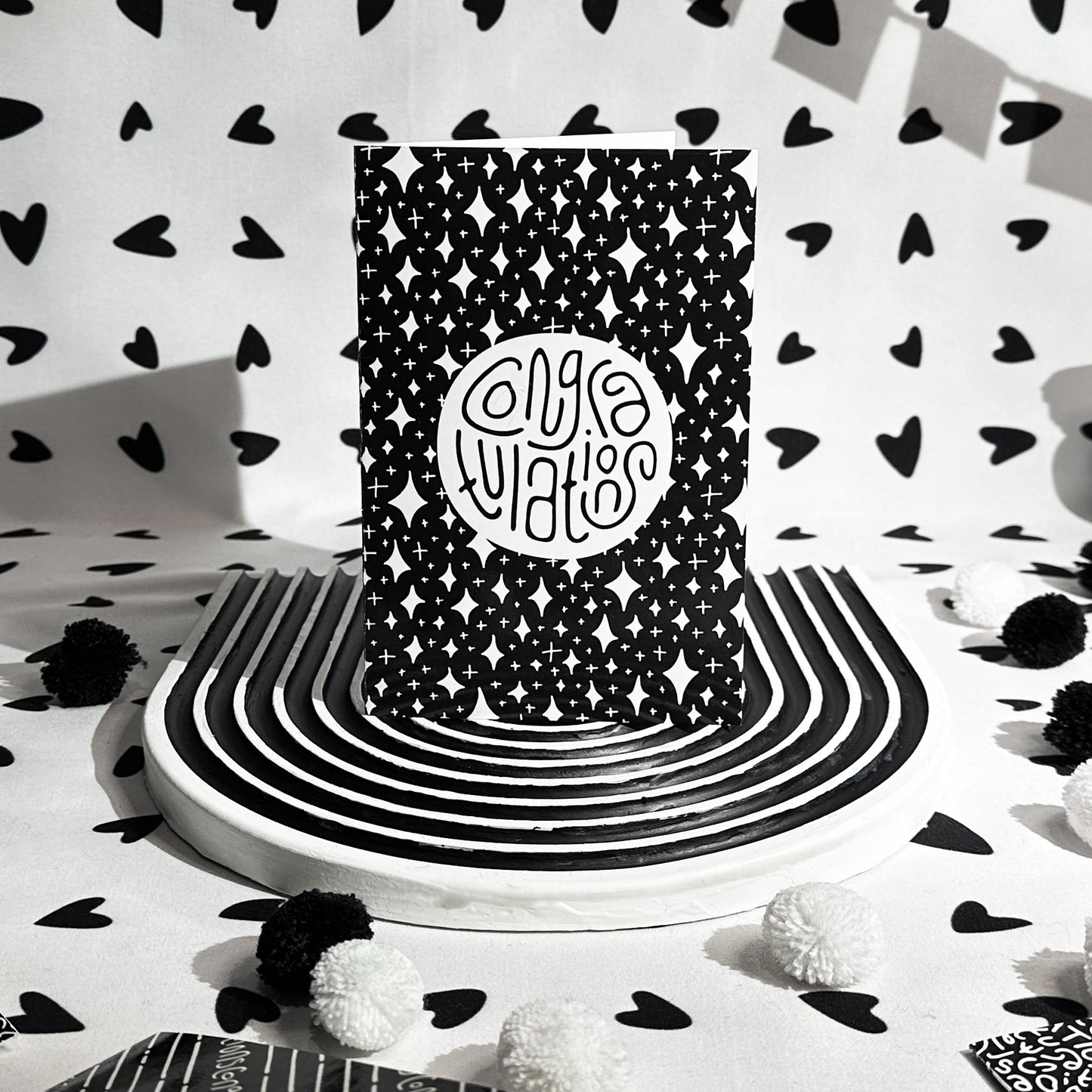 This congratulatory greeting card features a glossy sparkle pattern on the outside, front and back, and a 'congratulations' stamp-style message on the front. Inside, with a matte finish, you'll find a lettered 'congratulations' message that you have the option to color in as you please, or leave black and white. Pair this card with the Congratulations Wrapping Paper in Black & White for a seamless gifting look! And don't forget the Congratulations Gift Stickers in Black & White, they make a great finishing touch for both gift wrapping and adding to the blank envelope that comes with this card.